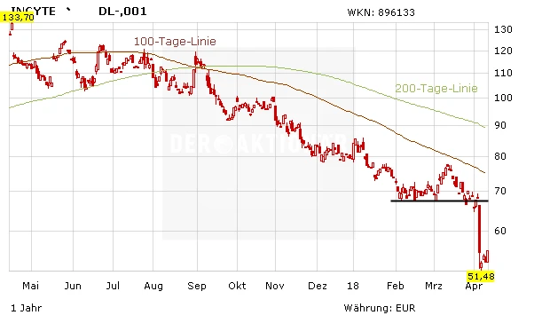 Das Gros der Analysten hat zwar die Kursziele für die Incyte-Aktie massiv gekappt, bleiben aber auf dem aktuellen Niveau optimistisch für den Titel. Allmählich können sich die Papiere von ihren Tiefständen lösen, doch die Enttäuschung wird noch lange überwiegen. Wer die Aktie hat bleibt dennoch mit einem Stoppkurs bei 51 Euro an Bord.