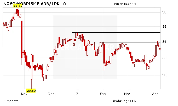 Die Aktie arbeitet derzeit an einer Bodenbildung. Langfristig sind die Aussichten für Novo zum einen wegen einiger hochinteressanter Produktlancierungen, zum anderen wegen des stark wachsenden Diabetes-Markts sehr gut, wieder auf den Wachstumspfad zurückzukehren. Ein erstes positives Signal würde der nachhaltige Sprung über die Marke von 34 Euro erzeugen. Knapp darüber wartet das Jahreshoch bei 35,50 Euro.