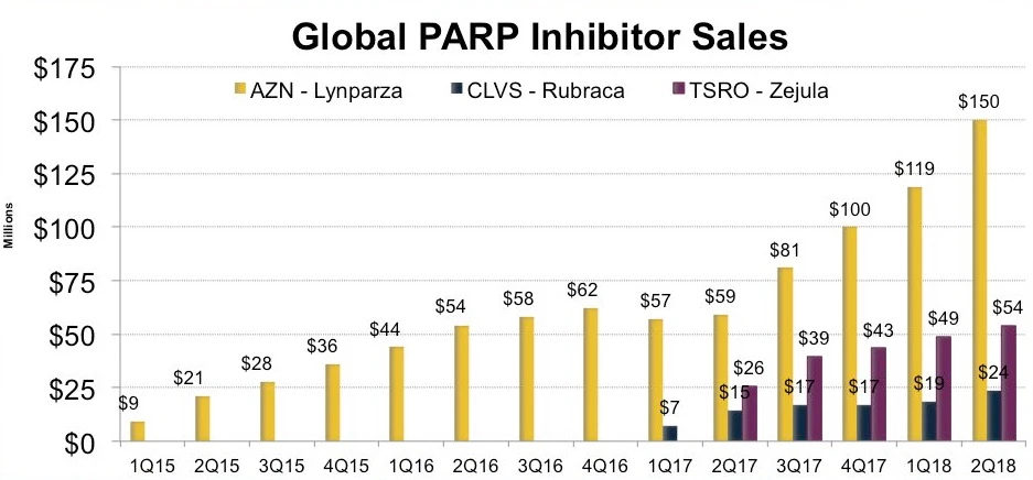 Gegen die starke Marktposition vom Pharma-Konzern Astrazeneca können sich Tesaro und Clovis Oncology nicht durchsetzen. Das Wachstum der zwei kleineren Biotech-Gesellschaften ist einfach nur enttäuschend. Lynparza von Astrazeneca hingegen verzeichnet kräftige Zuwächse und befindet sich auf dem besten Wege, zum Blockbuster zu reifen.