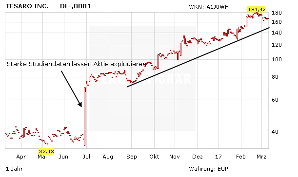 Auf Jahresbasis konnte die Tesaro-Aktie über 400 Prozent zulegen. Für den ersten Impuls Ende Juli 2016 sorgten die positiven Phase-3-Ergebnisse bei Patientinnen mit Eierstockkrebs. In den letzten Wochen gab es weitere Impulse durch die gestreuten Übernahmegerüchte. Angeblich sei Sanofi an Tesaro interessiert. Doch nicht nur in das Portfolio der Franzosen würde die US-Firma gut passen.