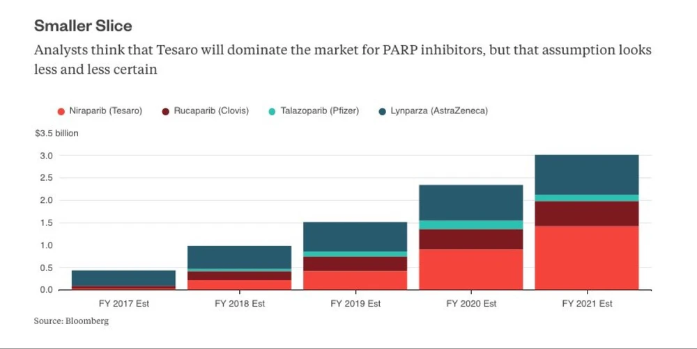 In der Indikation Eierstockkrebs wird Niraparib ab sofort in den USA erhältlich sein. Doch Tesaros Produkt muss sich mit namhafter Konkurrenz messen. Astrazeneca veröffentlichte hervorragende Phase-3-Studiendaten zum Eierstockkrebs-Präparat Lynparza, ebenfalls ein PARP-Inhibitor und direkter Konkurrent. Dazu gesellen sich noch Wirkstoffe von Clovis Oncology sowie Pfizer.