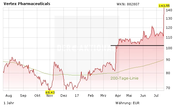 Was für ein Tag für die mit 4,5 Prozent achtgrößte Beteiligung im Portfolio von BB Biotech: Die Aktie von Vertex gewinnt am heutigen Mittwoch in Frankfurt fast 30 Prozent an Wert. Grund waren herausragende Studienergebnisse bei gleich mehreren Kombi-Studien im Bereich Zystische Fibrose. Für mindestens eine Kombi-Therapie soll im ersten Halbjahr 2018 die entscheidende Spätphasenstudie gestartet werden. Das ist der zweite starke Kurssprung für die Aktie in diesem Jahr. Bereits im März war das Papier förmlich nach oben durchgestartet, nachdem das Unternehmen starke Resultate bei zwei Phase-3-Kombinationsstudien ebenfalls bei Zystischer Fibrose veröffentlicht hatte. Hier könnte demnächst die Zulassung erfolgen.