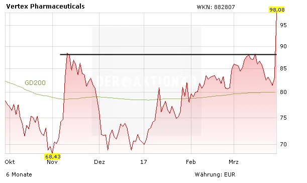Erst vor wenigen Wochen – in Ausgabe 09/17 – hat DER AKTIONÄR im Rahmen einer Übernahmestory die Aktie von Vertex genauer unter die Lupe genommen und als attraktives Investment eingestuft. Anleger, die der damaligen Kaufempfehlung gefolgt sind, können sich nun freuen. Das Papier gewinnt am heutigen Mittwoch mehr als 20 Prozent, nachdem das Unternehmen erstklassig Studienergebnisse für zwei Phase-3-Kombinationsstudien im Bereich Zystische Fibrose vorgelegt hat. Beide haben den primären Endpunkt erreicht. Vertex plant nun im dritten Quartal sowohl bei der amerikanischen als auch der europäischen Arzneimittelbehörde den Zulassungsantrag einzureichen.