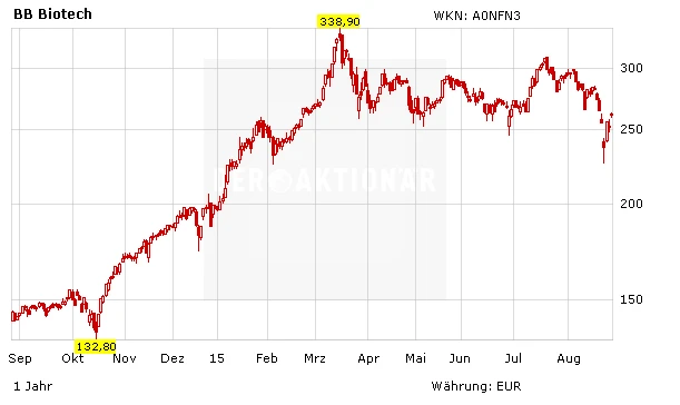 Zwar trauen sich Anleger hierzulande noch in deutsche Biotech-Unternehmen wie Morphosys zu investieren, doch winken viele bei den US-Werten ab. Dabei können sie von deren Entwicklung sogar mit einem europäischen Titel profitieren. BB Biotech ist eine Beteiligungsgesellschaft, die vorwiegend in US-Biotech-Werte investiert. Und das mit enormem Erfolg. Das Unternehmen konnte nicht nur den Vergleichsindex Nasdaq Biotech Index schlagen, sondern auch die namhaften Fonds aus der Biotech-Branche klar hinter sich lassen. Im zweiten Quartal hat BB Biotech einige aussichtsreiche Umschichtungen in seinem Portfolio vorgenommen und sich damit in Startposition für weitere deutliche Kurszuwächse gebracht. BB Biotech bleibt das Basisinvestment im Biotech-Sektor. Nach der jüngsten Korrektur haben Anleger noch einmal eine günstige Chance, sich im Biotech-Bereich zu engagieren beziehungsweise bestehende Positionen auszubauen. Zur Absicherung sollte ein Stopp bei 225,00 Euro platziert werden.