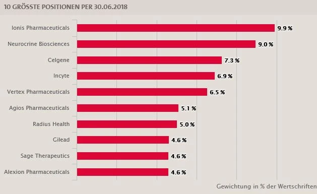 Spannend wird es in der kommenden Woche. Hier erfolgt am Freitag, 19. Oktober, die ordentliche Berichterstattung per 30. September 2018. Dann werden auch sämtliche Veränderungen im Portfolio, die im dritten Quartal erfolgt sind, veröffentlicht – sämtliche Neuaufnahmen, Verkäufe und die größten Positionen. Per 30. Juni gehörten zu den zehn Top-Werten: Ionis Pharmaceuticals (9,9 Prozent), Neurocrine Biosciences (9,0 Prozent), Celgene (7,3 Prozent), Incyte (6,9 Prozent), Vertex Pharmaceuticals (6,5 Prozent), Agios Pharmaceuticals (5,1 Prozent), Radius Health (5,0 Prozent), Gilead (4,6 Prozent), Sage Therapeutics (4,6 Prozent) und Alexion Pharmaceuticals (4,6 Prozent). An der Ländergewichtung – BB Biotech investiert nahezu ausschließlich in Werte aus dem US-Biotechsektor (zuletzt 97,0 Prozent) – dürfte sich nicht viel verändert haben. Nach wie vor spielt die Musik im Sektor in den USA.