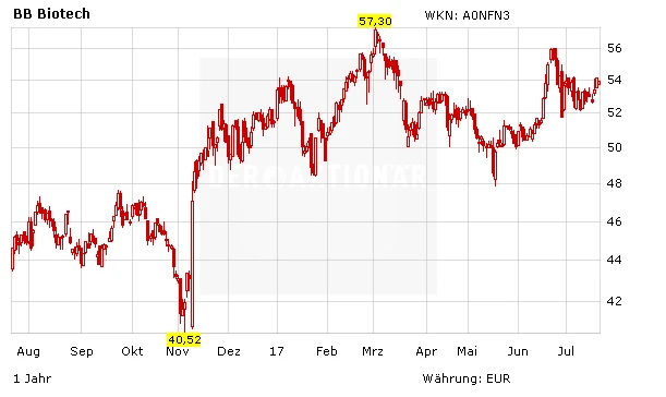 Derweil entwickelt sich auch der Auftakt zum dritten Quartal bei den Biotechaktien sehr gut. Der Nasdaq Biotech Index hat am Donnerstag erneut ein Prozent zugelegt und zwischenzeitlich sogar ein neues 52-Wochen-Hoch erreichen können. Wichtig wäre aus charttechnischer Sicht nun zunächst der Sprung über die Marke von 3.400 Punkten. Ein Ausbruch über 3.600 Zähler wäre ein klares Kaufsignal. Da BB Biotech zu 94 Prozent in US-Werte investiert ist, kann das Unternehmen stark von der Entwicklung der US-Biotech-Aktien profitieren. BB Biotech bleibt ganz klar das Basisinvestment im Sektor.