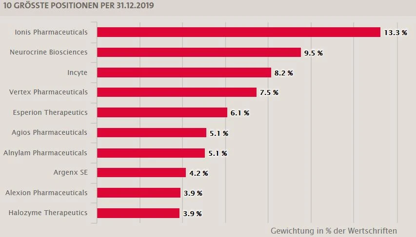 Das Investmentteam setzt die 2018 angestossene Neuausrichtung des Portfolios fort, um künftige Wachstumschancen innerhalb des Sektors zu nutzen. BB Biotech trennte sich im vierten Quartal 2019 von vier Beteiligungen und eröffnete eine neue Position. Unter den Top 4 gab es bei den Platzierungen keine Änderung, auf den Folgeplätzen wurden die Positonen jedoch ordentlich durcheinandergewirbelt. Die zehn größten Positionen per Ende Dezember 2019 waren folgende: