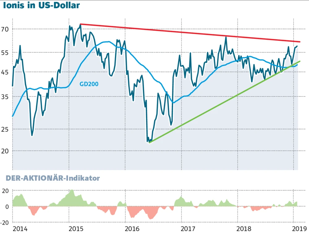 Ionis Pharmaceuticals ist mit Abstand die größte Beteiligung im Portfolio von BB Biotech – 15,1 Prozent beträgt der Anteil per Ende 2018. Und die Position könnte in den kommenden Wochen an Wert gewinnen. Charttechnisch steht die Ionis-Aktie vor einem starken Kaufsignal. Und auch von fundamentaler Seite kann die Biotech-Gesellschaft punkten, dank der Erreichung eines Meilensteins in der klinischen Entwicklung fließt frisches Kapital vom Schweizer Pharma-Giganten Roche.