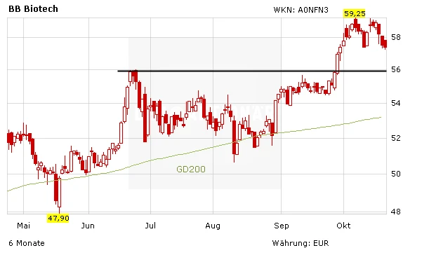 Das Schweizer Biotech-Beteiligungsunternehmen BB Biotech kann auf ein erfolgreiches drittes Quartal zurückblicken. Und auch für die nächsten Monate sieht das Umfeld gar nicht so schlecht aus. Der Nasdaq Biotech Index konnte sich zuletzt bereits gut erholen. Hier gilt es, die nächste Hürde bei 3.600 Punkten zu nehmen. Gelingt dies, würde BB Biotech stark profitieren, da der Großteil der Beteiligungswerte aus den USA stammt.