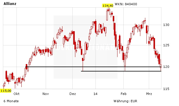 Die Allianz-Aktie ist wegen der Krim-Krise zuletzt stark zurückgekommen. Die massive Unterstützung im Bereich von 120 Euro hat aber bislang gehalten. Sollte die Lage in Osteuropa eskalieren, wird sich allerdings auch der Versicherer nicht gegen weitere Rückschläge wehren können. Der Stoppkurs des AKTIONÄR liegt bei 115 Euro.