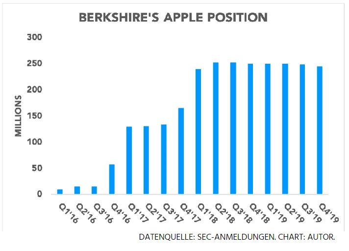 Sein größtes Investment Apple bezeichnete der Investor zuletzt als „das wahrscheinlich beste Unternehmen der Welt“. In einem Interview mit dem Fernsehsender CNBC sagte er, dass der iPhone-Produzent inzwischen „das dritte Geschäft“ der Firma Berkshire Hathaway sei. Im dritten Quartal hatte der Investor allerdings seine Position etwas abgebaut. Mittlerweile machen die Apple-Anteile noch rund 5,6 Prozent von Berkshires Portfolio aus (siehe Grafik unten).