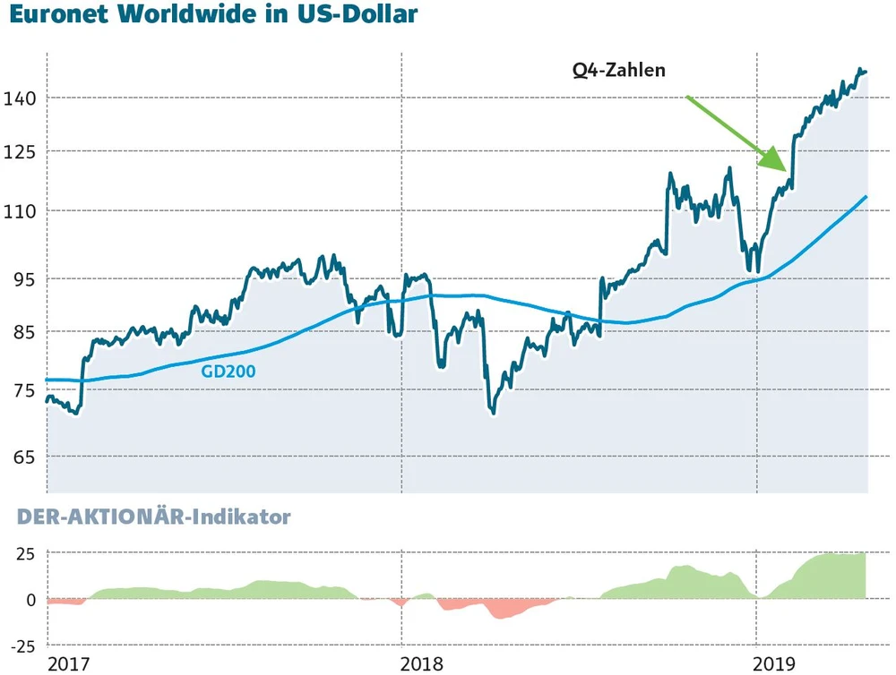 Neuen Schwung könnte die Aktie am 30. April erhalten. Dort verkündet Euronet Worldwide die Geschäftszahlen zum abgelaufenen Quartal. Bereits vorab erwarten die Analysten ein Umsatzplus von 9,5 Prozent im Vergleich zum Vorjahresquartal auf 602,5 Millionenen Dollar. Beim Gewinn je Aktie wir mit einem Anstieg auf 0,83 Dollar gerechnet, was einem Plus von rund 14 Prozent entspricht. Sollte es Euronet Worldwide gelingen sowohl beim Umsatz als auch beim Gewinn die Vorjahresergebnisse wirklich deutlich zu steigern, dürfte dies der Aktie einen erneuten Schub verleihen. Bereits im Februar bei der Präsentation der Q4-Zahlen konnte das Unternehmen positiv überraschen und kletterte im Anschluss steil nach oben.