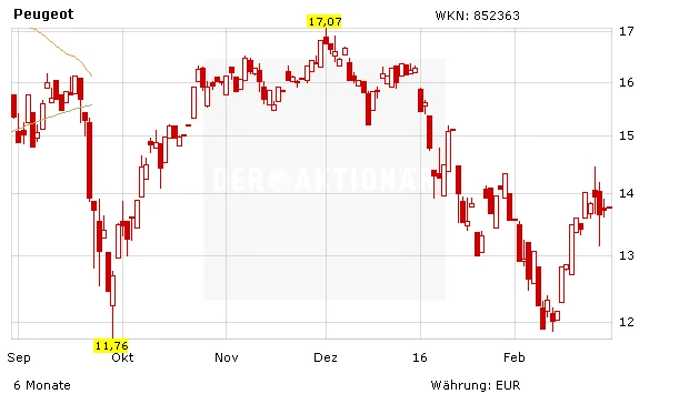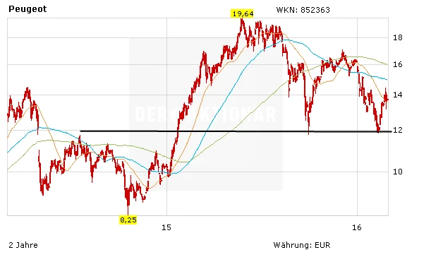 Auch DER AKTIONÄR bleibt bei seinem Urteil. Peugeot ist auf Turnaround-Kurs. Vorstand Carlos Tavares wird den Autobauer wieder in die Spur bringen, die Zahlen bestätigen den Aufwärtstrend. Die Aktie hat erneut von der 12,50-Marke Unterstützung erhalten und nach oben gedreht. Peugeot ist sicherlich die spekulativste Wette unter den Autowerten in Europa, auf dem aktuellen Niveau aber ein klarer ein Kauf! Aufgrund der sehr volatilen Märkte sollte die Position mit einem engen Stopp aktuell rund sieben Prozent unter dem Einstiegskurs abgesichert werden.