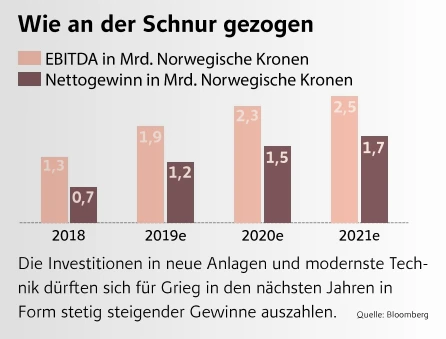 Der Ausbau der Produktionsanlagen sowie das disziplinierte Kostenmanagement machen es möglich: Selbst ohne weiter steigende Lachspreise würden die Chancen, dass die Norweger ihre Aktionäre auch in den kommenden Jahren weiter mit nachhaltigem Wachstum erfreuen können, sehr gut stehen. Geht es nach den Prognosen der Analysten, so dürften Umsatz und Gewinne des Unternehmens weiterhin stetig steigen und noch an Dynamik zulegen (siehe Grafik unten). Dementsprechend positiv sind auch die Analysten für die Grieg-Papiere gestimmt. Von den zwölf Experten, die sich mit der Aktie befassen, raten elf zum Kauf, einer stuft sie mit Halten ein. Kein anderer der größeren börsennotierten Lachsproduzenten kommt auf einen derart hohen Anteil an Kaufempfehlungen wie Grieg.