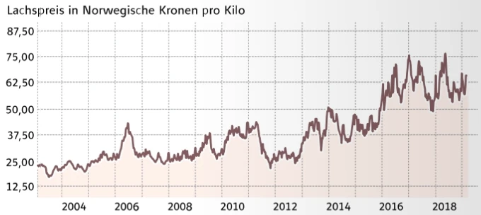 Es ist natürlich nicht zwangsläufig so, dass die besten Aktien der Welt auch aus dem besten Land der Welt kommen müssen. Dennoch lässt sich schwer abstreiten, dass Norwegen, das laut dem Human Development Index seit Jahren regelmäßig zum „Besten Land der Welt“ gekürt wird, auch über eine Vielzahl an sehr attraktiven Aktien verfügt. So sorgen derzeit an der Börse die norwegischen „Wasserstoffperlen“ Nel und Hexagon Composites für Furore. Ebenfalls viel Freude haben die Anleger an Tomra (mehr dazu im Langfristigen Musterdepot und im Chart-Check auf Seite 76) oder an Mowi. Der weltgrößte Lachszüchter profitiert derzeit weiterhin vom wachsenden Appetit der Weltbevölkerung auf Lachs. Denn der Fisch, der besonders reich an den gesunden Omega-3-Fettsäuren ist, wird längst nicht nur in Nordeuropa, sondern mittlerweile auch in vielen Schwellen- und Entwicklungsländern verspeist. Die Nachfrage aus Asien oder Lateinamerika wächst Jahr für Jahr mit zweistelligen Wachstumsraten. Obwohl die Lachsfarmbetreiber fleißig neue Zuchtanlagen errichten und bestehende ausbauen, dürfte 2019 das Angebotswachstum hinter dem Nachfragewachstum zurückbleiben. Gut möglich also, dass bei den Lachspreisen (siehe Chart) im laufenden Jahr neue Höchststände erreicht werden.