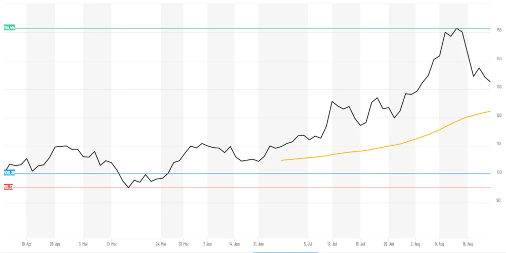 Das deutsch-australische Unternehmen Vulcan Energy legte seit Jahresanfang sogar mehr als 300 Prozent zu. Vom Höchstkurs bei knapp zehn Euro Mitte August notiert die Aktie aktuell 25 Prozent tiefer. Vulcan strebt an, weltweit der erste Lithium-Produzent zu werden, der aus einem Projekt im Südwesten Deutschlands Lithium klimaneutral mittels Geothermie fördert.