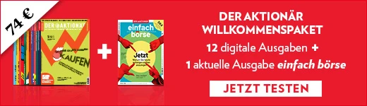 Das Willkommenspaket von DER AKTIONÄR macht Ihnen den Einstieg leicht: Mit 12 digitalen Ausgaben zum Vorteilspreis von 74 statt 98,60 Euro sparen Sie über 20 Prozent. Zusätzlich erhalten Sie eine aktuelle Ausgabe einfach börse mit Tipps rund um die moderne Geldanlage.