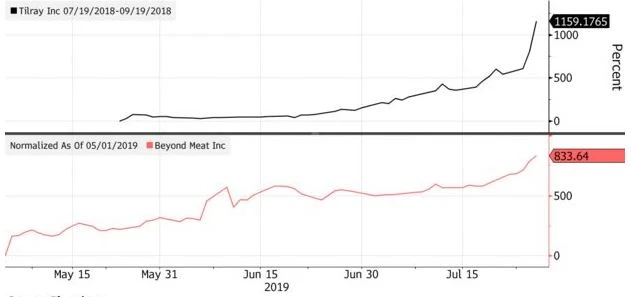Mit einer solchen Blitz-Performance können in den vergangenen Jahrzehnten nur ganz wenige Papiere mithalten. Doch ein Titel lief sogar noch besser als Beyond Meat: Tilray. Das Cannabis-Unternehmen ging im Juli 2018 an die Börse. Zwei Monate später stand die Aktie exakt 1.160 Prozent höher.