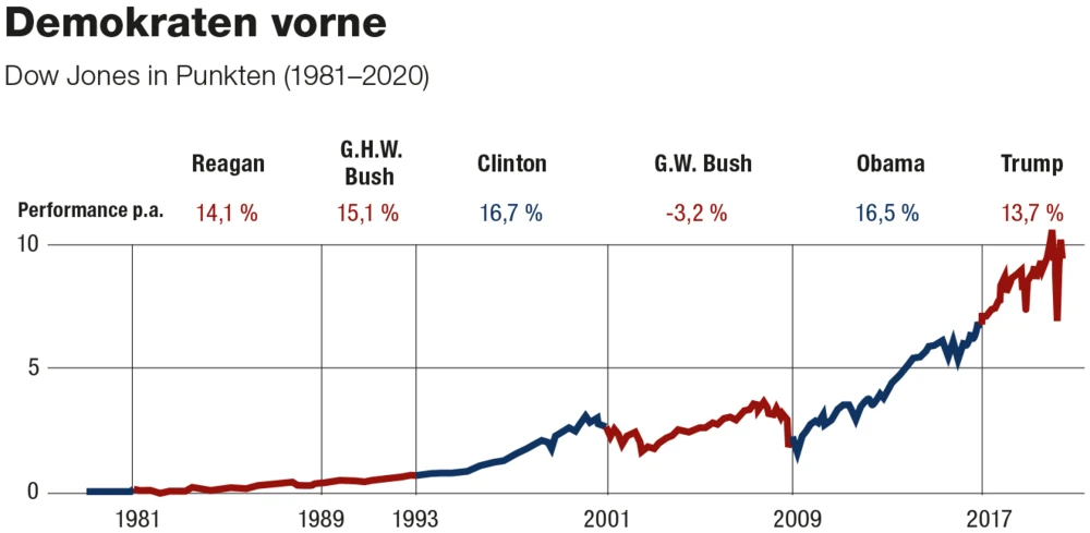 Es ist – von einem Corona-Impfstoff einmal abgesehen – die Mutter aller Themen: Wen wählt Amerika Anfang November zum Präsidenten? Amtsinhaber Donald Trump mit seiner Macher-Attitüde wäre wohl gut für die Aktienmärkte. Seit seiner Wahl Ende 2016 hat sich der Dow Jones immerhin um 58 Prozent in die Höhe geschraubt. Der Zusammenhang scheint klar: Die Republikaner an der Macht, das heißt weniger Regulierung, eine unternehmensfreundliche Politik und niedrigere Steuern. Es ist so einfach – und doch falsch. Tatsächlich performen die US-Märkte unter demokratischen Präsidenten mit einem durchschnittlichen jährlichen Anstieg von 9,7 Prozent besser. Unter Republikanern fällt das Plus mit 6,7 Prozent signifikant niedriger aus. Die grundlegende Erkenntnis vieler anderer Erhebungen in diesem Zusammenhang ist jedoch eine, die man aus dem reichen Fundus an Börsenweisheiten ohnehin kennt: Politische Börsen haben kurze Beine und langfristig steigen Aktien immer.