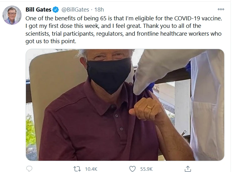 Microsoft-Gründer Bill Gates hat eine Corona-Impfung bekommen. "Einer der Vorteile, 65 zu sein, ist der Zugang zum Covid-19-Impfstoff", schrieb Gates am Freitag bei Twitter. Er habe diese Woche die erste der zwei Impfdosen erhalten - "und ich fühle mich großartig".