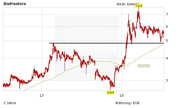 Neuen Schwung kann dies der Aktie von Biofrontera in jedem Fall erst einmal nicht verleihen. Der Wert befindet sich derzeit in einer ausgedehnten Konsolidierungsphase, nachdem sich das Papier seit November vergangenen Jahres zwischenzeitlich mehr als verdoppeln konnte. Seit der Empfehlung des AKTIONÄR im Dezember 2017 notiert die Aktie derzeit rund 37 Prozent im Plus. Spannend dürfte es insbesondere im August wieder werden, wenn die Halbjahreszahlen veröffentlicht werden. DER AKTIONÄR empfiehlt, die Gewinne von Biofrontera mit einem Stopp bei 4,90 Euro weiter laufen zu lassen. Langfristig sieht DER AKTIONÄR hier durchaus Potenzial für zweistellige Kurse.