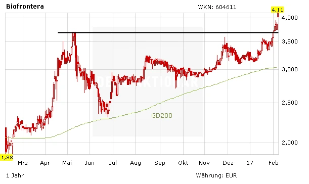 Bereits im Jahr 2011 hat das Mittel die Zulassung in Europa erhalten. Der Absatz verläuft seitdem allerdings eher schleppend. Der Grund für die schwache Entwicklung liegt im Erstattungsprozedere hierzulande. Die bislang zugelassene Therapie in Kombination mit einer Lampe ist für die Ärzte im Hinblick auf die geringen Einnahmen zu aufwendig, weswegen andere Mittel und Methoden bevorzugt werden. Bei der Daylight-Therapie, die nach den starken Daten nun bald zugelassen werden dürfte, minimiert man quasi die Arbeit in der ärztlichen Praxis. Damit wird Ameluz auch hierzulande schlagartig wieder interessant. Zudem läuft das Geschäft in den USA immer besser an. Mit der Meldung gelang der Aktie der charttechnische Ausbruch über die Marke von vier Euro. Der Weg in Richtung der alten Höchststände im Bereich von fünf Euro dürfte nun frei sein.