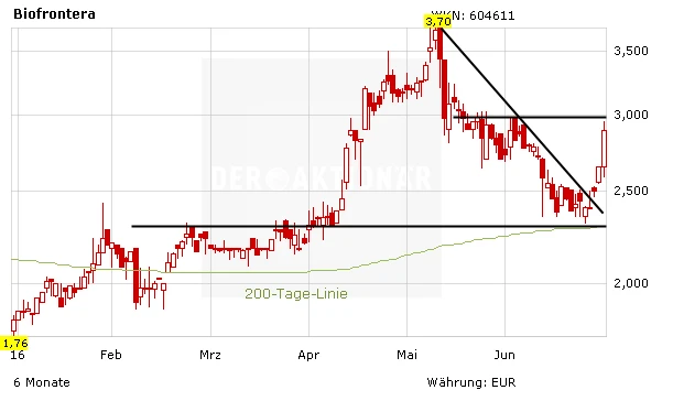 Die Aktie von Biofrontera hat ihre Korrekturphase seit Bekanntwerden der US-Zulassung nun abgeschlossen. Zuletzt hatte das Papier die 200-Tage-Linie erfolgreich getestet. Am heutigen Donnerstag gewinnt die Aktie mehr als neun Prozent auf 2,89 Euro und kratzt damit wieder an der 3-Euro-Marke. Die Aktie ist weiterhin ein Kauf.