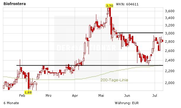 Auf die jüngste Meldung zeigt die Aktie von Biofrontera zwar keine große Reaktion, zuletzt hat der Wert aber bereits deutlich zulegen können. Zuvor hat das Papier die 200-Tage-Linie erfolgreich getestet. Die nächste Hürde, die es zu überwinden gilt, ist die insbesondere psychologisch wichtige 3-Euro-Marke. Die Aktie bleibt ein Kauf. Im September dürfte der Vertriebsstart von Ameluz in den USA erfolgen. Dies dürfte Biofrontera weiteren Auftrieb verleihen.