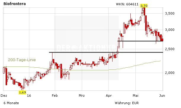 Auch DER AKTIONÄR empfiehlt die Aktie von Biofrontera klar zum Kauf. Die derzeitige Konsolidierungsphase sollte bald abgeschlossen sein und der Wert wieder Kurs auf die psychologisch wichtige Marke von drei nehmen.