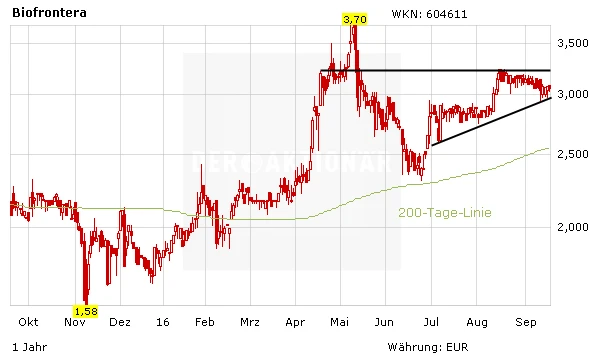 Vor einigen Wochen erhielt Biofrontera die Zulassung für Ameluz in den USA – dort wartet ein enormes Marktpotenzial. Auch in Europa kann mit der Zulassungserweiterung mit steigenden Umsätzen gerechnet werden. Der Aufwärtstrend bei Biofrontera ist weiter intakt. Aktuell konsolidieren die Papiere im Bereich von drei Euro. Die nächsten Widerstände befinden sich in den Bereichen 3,15 Euro und 3,25 Euro – mutige Anleger legen sich eine Position ins Depot.