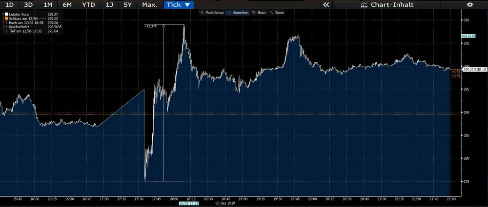 Nach einem wilden Ritt beendete die Biogen-Aktie den Handel mit einem Kursplus von 3,4 Prozent auf 299,39 Dollar.