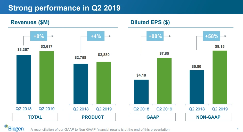 Biogen steigerte den Konzernumsatz im zweiten Quartal um acht Prozent auf 3,62 Milliarden Dollar (Schätzung: 3,48 Milliarden Dollar). Auch beim Ergebnis mit 9,15 Dollar (Erwartung: 7,53 Dollar) schnitt Biogen deutlich besser ab.