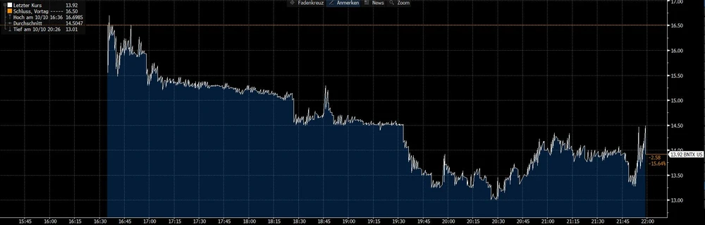 Nach einem erfreulichen Handelsbeginn drehte die BioNTech-Aktie dann doch deutlich ins Minus – nicht ungewöhnlich für ein neu notiertes, aufstrebendes Biotech-Unternehmen mit einer Bewertung von rund 3,5 Milliarden Dollar.