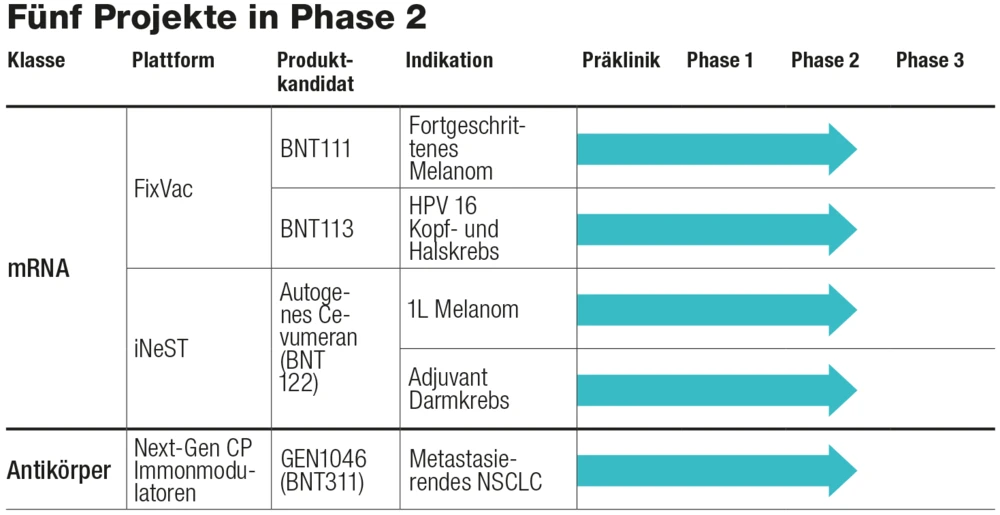 Zwar wird es noch einige Zeit dauern, bis BioNTech die ersten Krebstherapien am Markt haben wird. Experten rechnen damit frühestens in zwei Jahren. Derzeit befinden sich fünf Projekte in der Phase 2 der klinischen Entwicklung (siehe Pipeline S. 34) – unter anderem Therapien gegen schwarzen Hautkrebs sowie Darmkrebs.