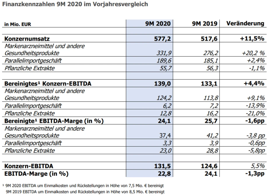 Insgesamt steigerte Dermapharm seinen Umsatz bis Ende September den Angaben zufolge um 11,5 Prozent auf 577,2 Millionen Euro. Analysten hatten im Schnitt etwas mehr erwartet. Das bereinigte Ergebnis vor Zinsen, Steuern und Abschreibungen (bereinigtes Ebitda) legte um 4,4 Prozent auf 139 Millionen Euro zu.