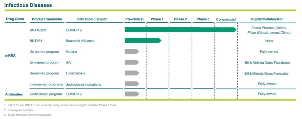 Nicht so breit, allerdings ebenfalls gut bestückt, ist die Pipeline mit den Projekten gegen Infektionskrankheiten. BioNTech hat mit der erfolgreichen und schnellen Entwicklung von Comirnaty gezeigt, dass das Unternehmen technologisch in der Lage ist, einen hochwirksamen Impfstoff zu entwickeln.