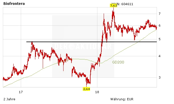 Die Aktie von Biofrontera reagiert auf die News mit einem Kursplus von mehr als drei Prozent. Anleger, die der Empfehlung des AKTIONÄR im Dezember 2017 gefolgt sind, können sich mittlerweile bereits über einen Gewinn von über 45 Prozent freuen. Nicht nur die guten News überzeugen, auch charttechnisch ist weiterhin alles im Lot. Zuletzt hat die Aktie erfolgreich die 200-Tage-Linie verteidigt. Die nächste Hürde, die es zu überwinden gilt, liegt bei 6,50 Euro. Ein Stopp bei 4,90 Euro sichert nach unten ab.