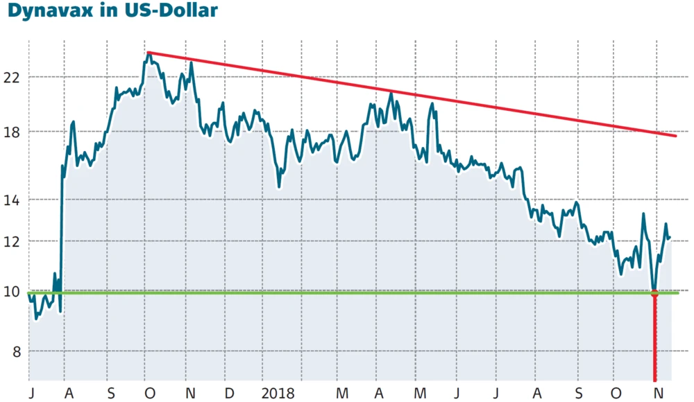 Im schwachen Gesamtmarkt sind die starken Resultate von Dynavax zunächst untergegangen. Fängt sich der Markt, sollte die Aktie zum Rebound ansetzen und den Abwärtstrend verlassen. Allerdings bleibt die Aktie nur äußerst risikobewussten Anlegern vorbehalten. AKTIONÄR-Leser liegen mit der Empfehlung in Ausgabe 45/2018 trotz des schwachen Gesamtmarktes bereits gut 20 Prozent im Plus, die hochspekulative Rebound-Chance ist unverändert intakt.
