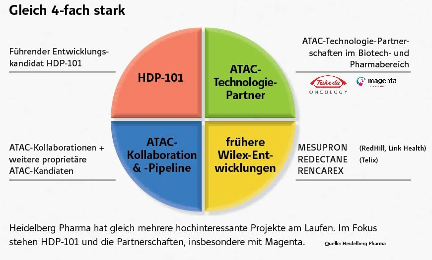 Es handelt sich um die Aktie von Heidelberg Pharma, die 2017 aus der ehemaligen Wilex hervorgegangen ist. Das Unternehmen verfolgt eine vielversprechende Strategie, die im Groben auf vier Säulen beruht (siehe Grafik): dem am weitesten fortgeschrittenen Projekt HDP-101, den weiteren Entwicklungskandidaten, den hochinteressanten Partnerprojekten und dem ehemaligen Wilex-Portfolio. Hochinteressant ist außerdem die Beteiligungsstruktur. Dietmar Hopp und seine Dievini Hopp Biotech Holding halten 75 Prozent der Anteile. Bei den Kapitalerhöhungen in der Vergangenheit konnte sich Heidelberg Pharma regelmäßig auf den Großinvestor verlassen – was gerade für kleine Biotech-Unternehmen enorm wichtig ist.