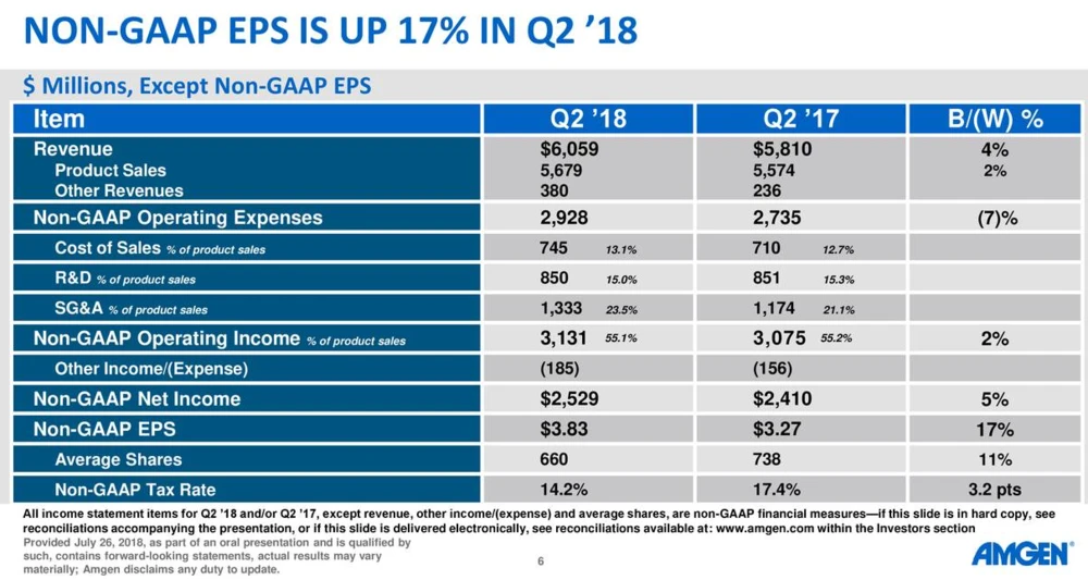 Mit neuen Produkten wie Repatha will Amgen die wegbrechenden Umsätze von Enbrel und Co kompensieren. Beim Medikament gegen Rheumatoide Arthritis musste der Biotech-Konzern einen Rückgang von elf Prozent auf 1,3 Milliarden Dollar verkraften. Repatha hingegen – einem Cholesterinsenker – wuchs um satte 78 Prozent auf 148 Millionen Dollar. Auch das Osteoporose-Mittel Prolia bescherte Amgen im zweiten Quartal einen kräftigen Zuwachs von 21 Prozent auf 610 Millionen Dollar. Im zweiten Halbjahr dürfte insbesondere der Fokus auf Aimovig, einem Medikament zur Migräne-Prävention welches gemeinsam mit der Schweizer Novartis entwickelt wurde, liegen.