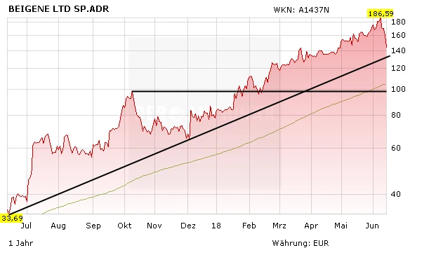 Durch die Megakooperation mit Celgene darf BeiGene in China sogar Revlimid, Vidaza und Abraxane der Amerikaner vertreiben. In Summe rechnen Analysten mit einem Umsatz von gut elf Milliarden Dollar für Celgene im Jahr 2018. Gelingt es BeiGene, die Top-Seller der US-Biotech-Gesellschaft auch nur annähernd auf dem chinesischen Markt zu etablieren, könnte BeiGene ähnlich durchstarten, wie es Celgene in den vergangenen Jahren gelungen ist.