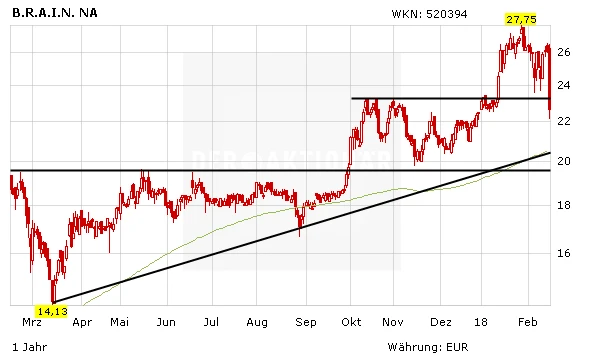 Ein schwacher Start im ersten Quartal des laufenden Geschäftsjahres 2017/18 hat die Aktie der BRAIN AG am Donnerstag kräftig auf Talfahrt geschickt. Mehr als zwölf Prozent verliert das Papier am Nachmittag auf 22,80 Euro. Wie BRAIN mitteilte, wir die erwartete Umsatzsteigerung gegenüber dem Vorjahresquartal nicht erreicht werden können. Demnach wird der Konzernumsatz im ersten Quartal 2017/18 voraussichtlich einen Wert von 5,3 Millionen Euro erreichen und damit 13,1 Prozent unter dem Vorjahreswert von 6,1 Millionen Euro liegen. Die Gesamtleistung im ersten Quartal 2017/18 wird voraussichtlich mit einem Wert von 6,0 Millionen Euro um etwa 8,7 Prozent den Vorjahreswert verfehlen.
