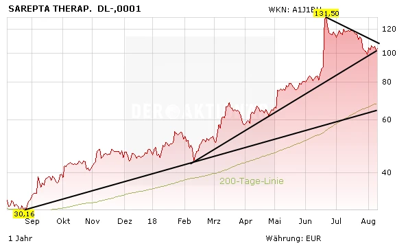 Sarepta verfügt mit Exondys 51 das bis dato einzige Medikament zur Behandlung der muskulären Erbkrankheit. Im zweiten Quartal steigerte die Biotech-Gesellschaft den Umsatz um satte 110 Prozent auf 73,5 Millionen Dollar (knapp zwei Millionen mehr als die Konsensschätzung). Damit begrenzte Sarepta den Verlust auf 0,43 Dollar pro Papier – Analysten rechneten im Schnitt mit einem Fehlbetrag von 0,89 Dollar. Hinzu kommt, dass das Ergebnis durch höhere Forschungs- und Entwicklungskosten geschmälert wurde. Sarepta befindet sich also weitaus näher an der Gewinnschwelle, als der Verlust andeutet.