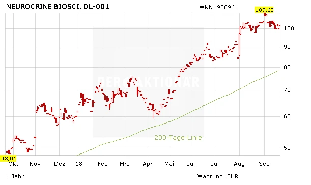 Seit dem Verkaufsstart ist Ingrezza ein Riesenerfolg. In allen fünf Quartalen ließ sich ein starkes Umsatzwachstum beobachten. Basierend auf den ersten Wachstumszahlen erwarten die Analysten von Morgan Stanley einen Verkaufserlös von 425 bis 435 Millionen Dollar für das laufende Geschäftsjahr. Ganz klar: Der Kassenschlager Ingrezza ist der Grund für die Rallye der Neurocrine-Aktie.