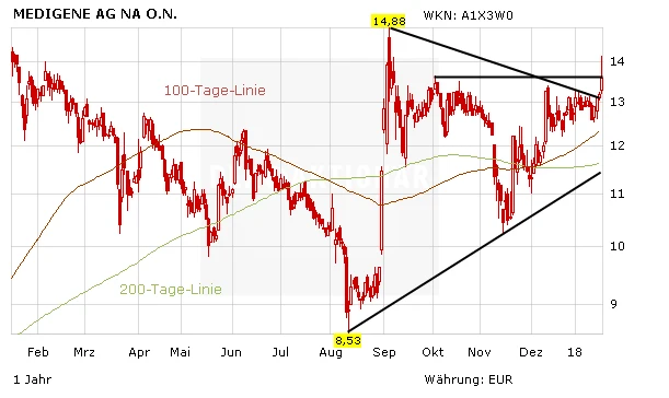 Dank der Fantasie aus Übersee hat die Medigene-Aktie ein klares charttechnisches Kaufsignal generiert und das aufsteigende Dreieck nach oben verlassen. Im gleichen Atemzug gelang der Sprung über den horizontalen Widerstand im Bereich von 13,60 Euro. Nun rückt das 52-Wochen-Hoch wieder in den Fokus der Anleger. Langfristig orientierte spekulative Anleger nutzen die frischen Impulse zum Einstieg.