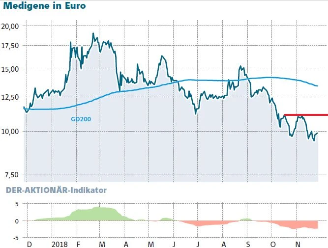 DER AKTIONÄR sieht die ähnlich. Das mögliche Kursziel setzt DER AKTIONÄR aber nicht so hoch an. Langfristig kann sich Medigene zwar im Erfolgsfall durchaus vervielfachen, das Risiko bei dem Wert ist aber weiterhin enorm hoch. Man befindet sich erst noch in einer sehr frühen Entwicklungsphase. Aus charttechnischer Sicht wäre nun erst einmal wichtig, das November-Zwischenhoch bei 11,39 Euro wieder zu übertreffen.
