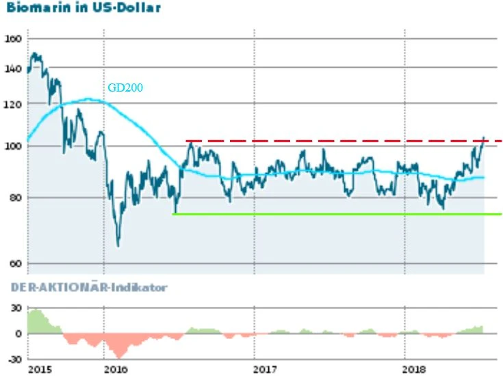 Mittlerweile rund zwei Jahre war die Aktie von Biomarin Pharmaceutical im Seitwärtstrend im Bereich von knapp 80 bis 100 Dollar gefangen. Zuletzt hatte es sich bereits angedeutet, dass der große Ausbruch nach oben bevorstehen könnte. Die Aktie präsentierte sich in den vergangenen Monaten enorm stark. Und tatsächlich: Am gestrigen Donnerstag gelang dem Wert mit einem Kursplus von 3,2 Prozent auf 103,31 Dollar endlich der große Ausbruch nach oben.