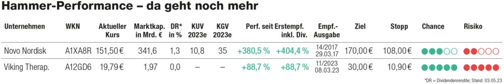 Auch mit der eher defensiven Aktie von Novo Nordisk konnten AKTIONÄR-Leser in den vergangenen Jahren prächtig verdienen. In sechs Jahren hat die Aktie inklusive Dividenden eine Performance von über 400 Prozent auf das Börsenparkett gezaubert. Das kommt nicht von ungefähr: Erst kürzlich hat Novo Nordisk seine Planvorgaben massiv nach oben korrigiert. Die zuletzt dynamische operative Entwicklung fußt vor allem auf einem wachstumsstarken Medikament: der „Abnehmspritze Wegovy. In den USA ist um das Mittel ein regelrechter Hype entstanden, Novo Nordisk hatte zeitweise Probleme, die immense Nachfrage nach Wegovy überhaupt zu bedienen.