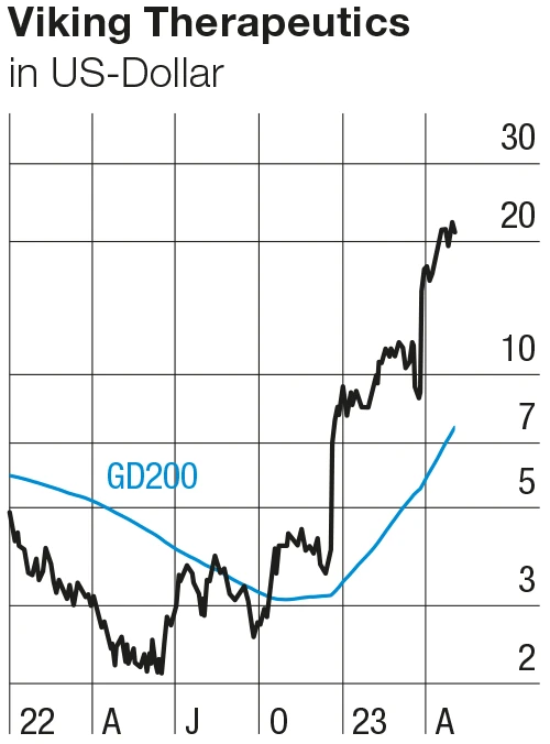 Ein viel beachtetes Thema ist derzeit der Markt für Abnehmpräparate. Laut einem Report der World Obesity Foundation könnte bereits in 12 Jahren mehr als die Hälfte der Weltbevölkerung übergewichtig oder fettleibig sein. Ein Billionen-Dollar-Markt mit hohen Wachstumsmöglichkeiten für Gewichtsreduktionsmittel und damit auch für Novo Nordisk, Eli Lilly sowie andere Player. „Einer der Überflieger der vergangenen Monate ist Viking Therapeutics. Das Unternehmen profitierte von Daten eines Gewichtsreduktionsmittels“, so Doepke. „Hier könnte langfristig ein neuer Blockbuster-Kandidat heranreifen.“ Ein Blick auf den Chart zeigt das immense Potenzial auf, das der Markt derzeit Viking Therapeutics beimisst. Ausgehend vom 52-Wochen-Tief konnte der Biotech-Hot-Stock in der Spitze vor Kurzem über 1.000 Prozent zulegen.
