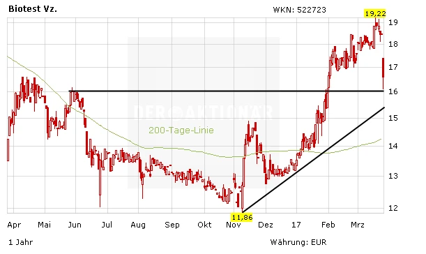 Biotest zählte in den vergangenen Monaten zu den absoluten Top-Performern im deutschen Nebenwerte-Bereich. Gut möglich, dass weitere Anleger Kasse machen und der heutige Kursrücksetzer erst den Anfang einer scharfen Korrektur darstellt. Die nächsten Unterstützungen befinden sich im Bereich von 15,50 Euro sowie die 200-Tage-Linie bei 14,25 Euro.